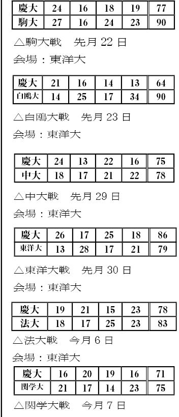 2勝4敗で迎えた駒大戦。1部昇格のために絶対に負けられない慶大だったが、77―90で駒大に敗れた。 両校、前半は速攻主体で展開した。慶大は黒木(環1)のオフェンスリバウンドで、チャンスを増やす。前半を40―43で終えて、ほぼ互角の状態で後半を迎える。 第3Qに入るとその均衡が崩れた。慶大のファウルが増え、多くのフリースローを与えてしまう。伊藤(環2)のドライブで得点を重ねるものの、58―67の9点ビハインドで第3Qを終える。 第4Q、悪い流れを断ち切りたい慶大は積極的にオールコートプレスをかける。しかし流れは変えられず、77―90で駒大に敗れた。 この敗戦で3連敗となった慶大。1部昇格には暗雲が立ち込めている。