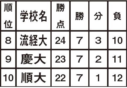 苦しい試合が続く後期。専大戦まで4連敗を喫し下位に沈む。2部降格も見えかけたが、日体大、神大に連勝。今月10日、神大が国士大に負け、慶大の10位以上が確定し、1部残留が決まった。8位争いが混戦だ。(井口聡一郎・樫村拓真・小林知弘)