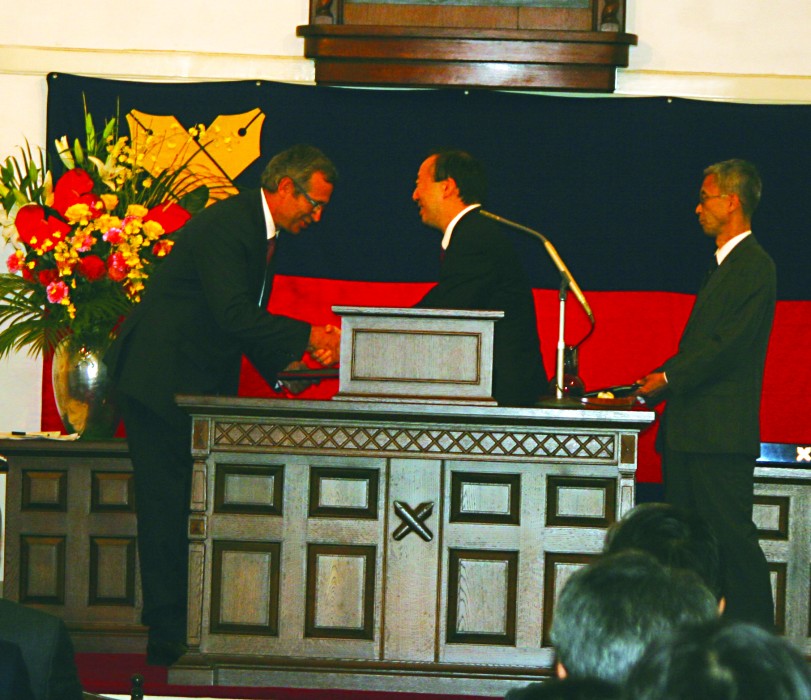 慶大は先月26日、パトリック・シェドマイユ氏に名誉博士称号を授与した。同氏のロボティクス、計算機援用機械工学分野における研究教育、新技術の開発の功績、および慶大と仏理工系高等教育機関Ecole Centrale de Nantes(ECN)とのダブルディグリー制度の締結など慶應義塾との国際交流プログラムの設計への貢献を顕彰した。