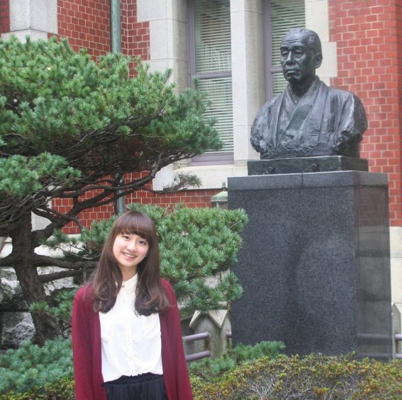 最後に紹介されたのは図書館旧館(以下、旧館)。慶應義塾のシンボルにもなっている旧館だが、ほとんどの学生は図書館新館を利用するため意外となじみが無いという。慶應義塾創立50周年記念に建てられたゴシック建築の旧館は国の重要文化財に指定され、地下2階から地上5階まで重要な書物を多数収納している。また、旧館前に立っているのは1万円札の肖像としてもおなじみの慶應義塾創立者、福沢諭吉の銅像だ。大学見学の記念に写真を撮っている人がよく見られるという。記者も記念に写真を1枚撮らせてもらった。