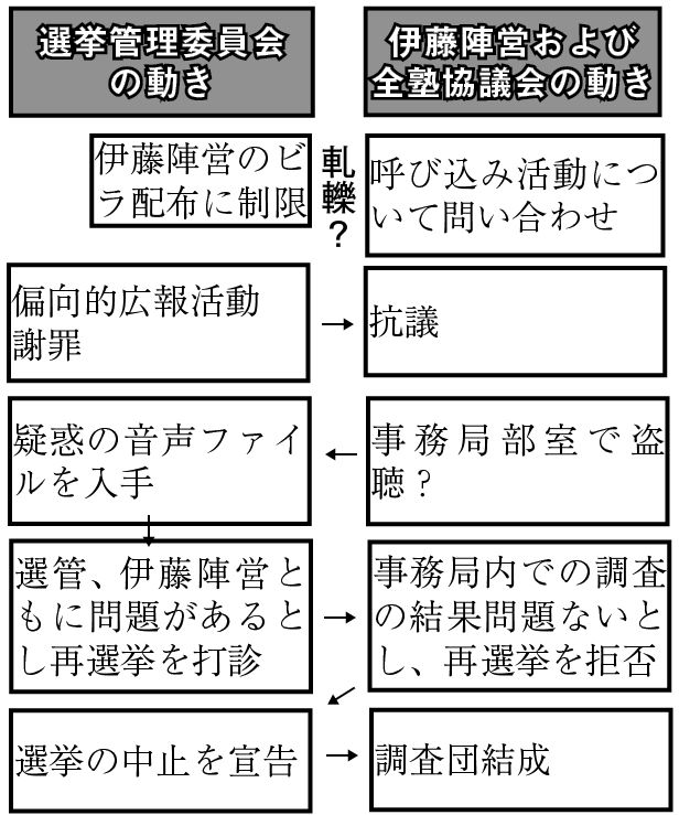 不正疑惑の内容は伊藤陣営の票の改ざん。不正のやり取りを録音したとされる音声ファイルを入手した選挙管理委員会が、伊藤候補に再選挙を打診、拒否されたことを発端に今日まで続く。