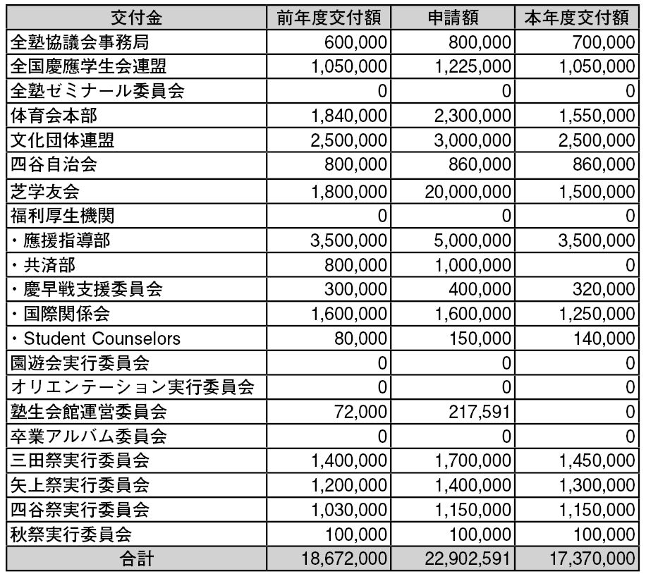 全体的な収支バランスは例年通りに落ち着いている。しかし、会計がずさんな団体や必要額を上回る申請をする団体など、問題点も多い。また、体育会をはじめ、全塾協議会からの交付金をさらに下部団体へ再交付している場合、その会計が表に出てこない傾向にある。会計を明るいものにするため、財政マニュアルや決算書の作成が今後、取り組まれていく。