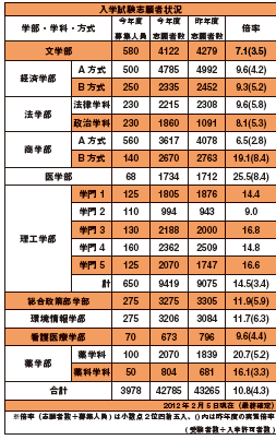 全体の志願者数は昨年度の43265人より480人減の42785人。2012年度より1.1%の減少だった。ここ数年、緩やかな減少傾向が続いているといえる。この背景としては、「長引く不況の影響から、受験生の安定志向や国公立大学志向、地方受験生者の地元志向などの傾向が続いているのではないか」と慶大入学センターは分析している。