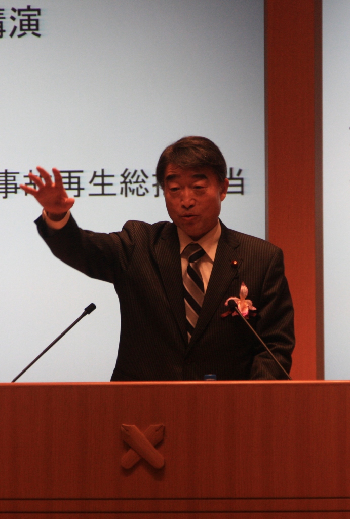 まず復興大臣である根本匠氏は、復興の現状と課題についての基調講演を行った。根本氏によれば、すでに現在の東北は高齢化やエネルギーの問題など、日本全体がこれから抱える問題に直面しているという。また、東北がこの問題を乗り越え復興を果たすことで、創造と可能性ある未来社会、「新しい東北」がつくりあげられるとも論じた。現在は総理の指示のもと、現場主義の徹底や復興予算の見直し、復興の加速化などに取り組んでいるという。