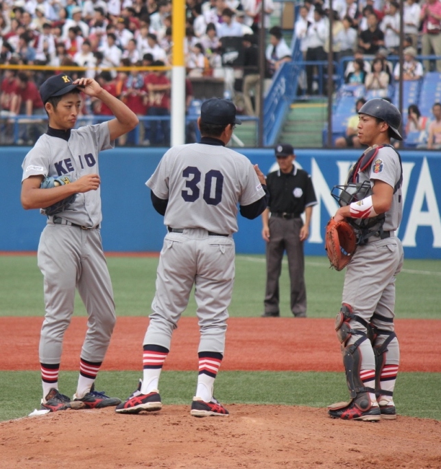 第1戦はエース白村(商4)が5回途中までに6失点と炎上。打線は早大先発有原の粘りの投球に対して得点を挙げることができずにいたが、5回に堀野(理4)の二ゴロ間に1点を挙げ、前節の明大戦から続いていた22回連続無得点記録にようやく終止符を打つ。8回には松本大(環4)の適時三塁打、手銭(環4)の適時打などで3点を返すも反撃及ばず。4―8で第1戦を落とした。