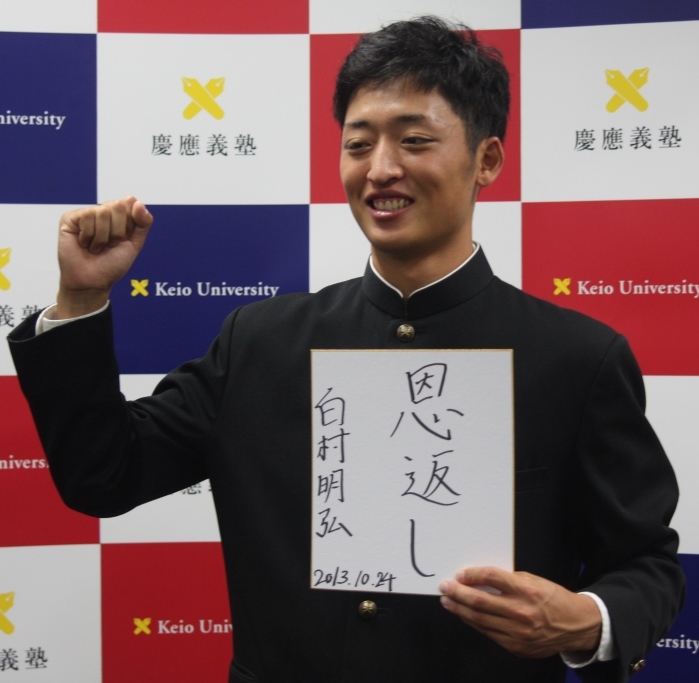 日吉キャンパス協生館にて会見が開かれた。白村投手は「諦めていた部分もあったが、こういう形で指名していただきホッとしている。指名を後悔させないよう、チームのために力を尽くせるような投手になりたい」と決意を表明した。