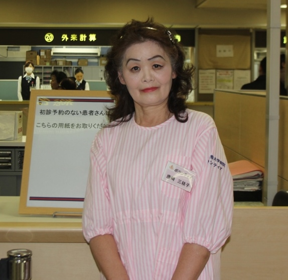 「患者さんから、助かりますなどと声をかけてもらえる時が一番嬉しいひと時です」と話すのは、25年もの間、活動を続けており、現在ボランティア年度リーダーを務める唐﨑三枝子さん。活動中は、常に患者さんの様子に目を配ることを忘れず、目についたことの中で出来そうなことは、出来る限り手伝うようにしているそうだ。