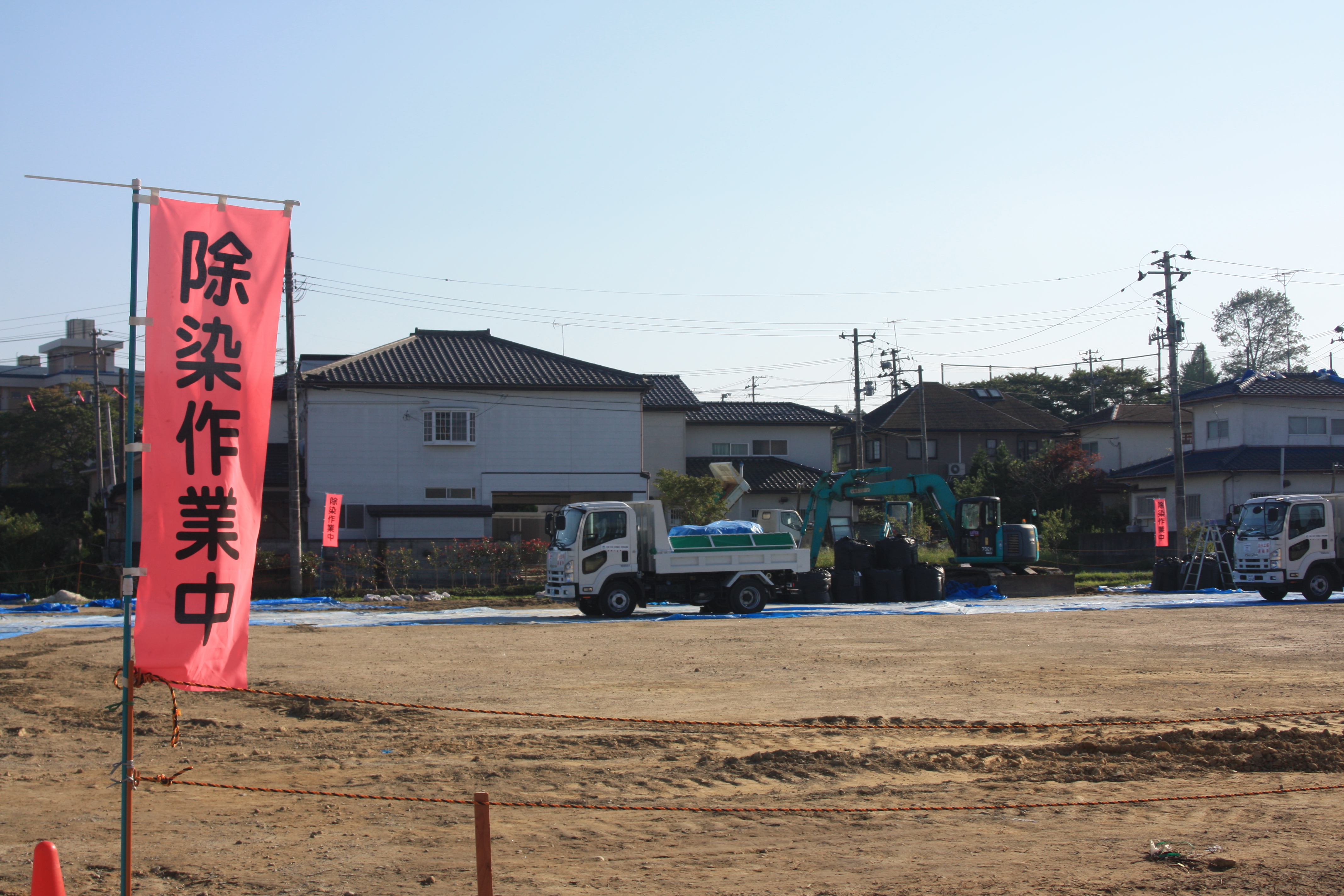道中目に付くのは、ピンク色ののぼり。「除染作業中」と書かれており、近くには作業用トラックや作業員の姿が見えた。