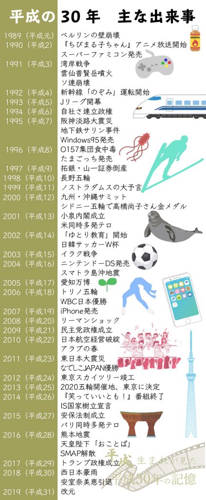 平成生まれ、平成育ちの記者が、複数の観点から平成を振り返る。平成という時代の向こう側へとこれから踏み出すため、改元を目前にした今考えてみよう。