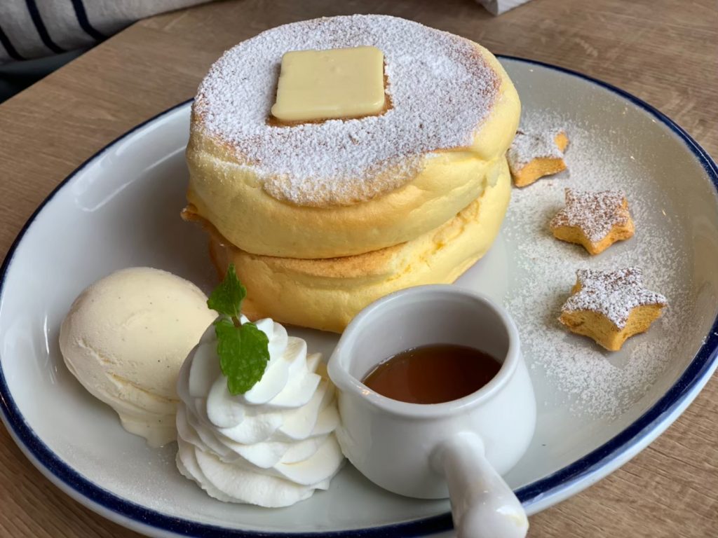 私たちは一番人気の「ふわふわとろける三ツ星パンケーキ」を注文した。鉄板で焼いたのち、オーブンでじっくり二度焼きするこだわりの製法で作られており、ひとくち食べた時点でそのふわふわ食感に驚かされる。パンケーキにはカナダ産のオーガニックメープルがふんだんにかけられている。横に添えられている北海道産バニラアイスと生クリームも、パンケーキのおいしさを引き立てている。甘さは控えめなので甘いものが苦手な人にとっても食べやすい。また、トッピングとしてホイップクリームやバニラアイスも追加できる。星形のクッキーが3つちょこんと添えられていて見た目もとても可愛らしい。写真映えすること間違いなしである。