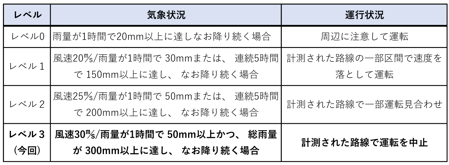計画運休は一体何を基準に実施するのだろうか。東急電鉄は次のように説明する。「他社の動向も考慮し、気象情報により、全線にわたり運転中止基準(表参照)を超過する、もしくは、台風の超過ピークが一定時間継続することが見込まれる場合に計画運休を実施する」