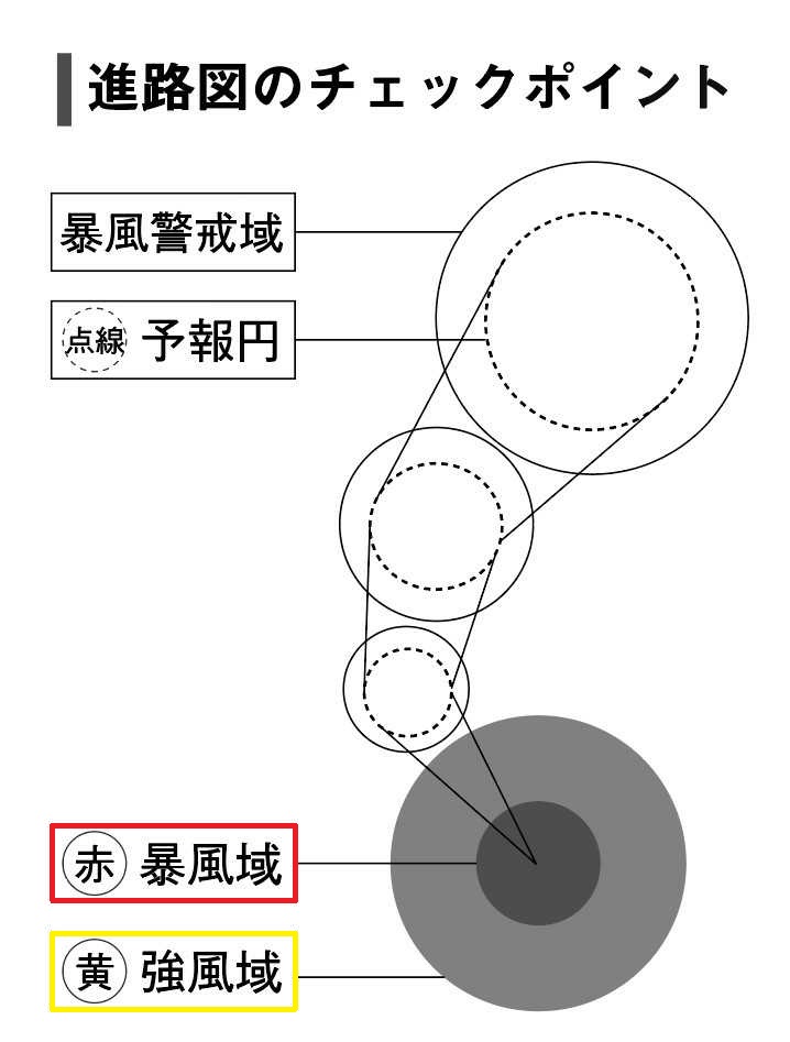 台風情報というと、進路予想図をよく目にするだろう。この予想図を見る時は、赤い円と黄色い円に注目したい。