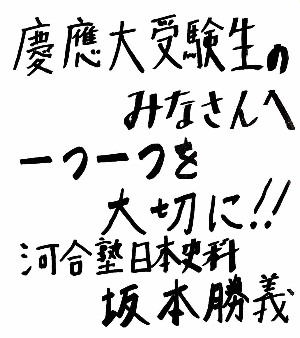 学部関係なく、慶大日本史はとにかく時間配分が勝敗を分けます。配点の高い語群補充問題は、解けるものから埋めていき、分からない空欄は語群を吟味することで正解に近づけていく必要があります。そのため、語群を吟味する時間をいかにして作るかが重要になってきます。慶大特有の難問奇問は解ける必要はないですが、過去に何度か出題された難問は解けるようにしておいてほしいです。解けるか解けないかで大きく差がついていきます。