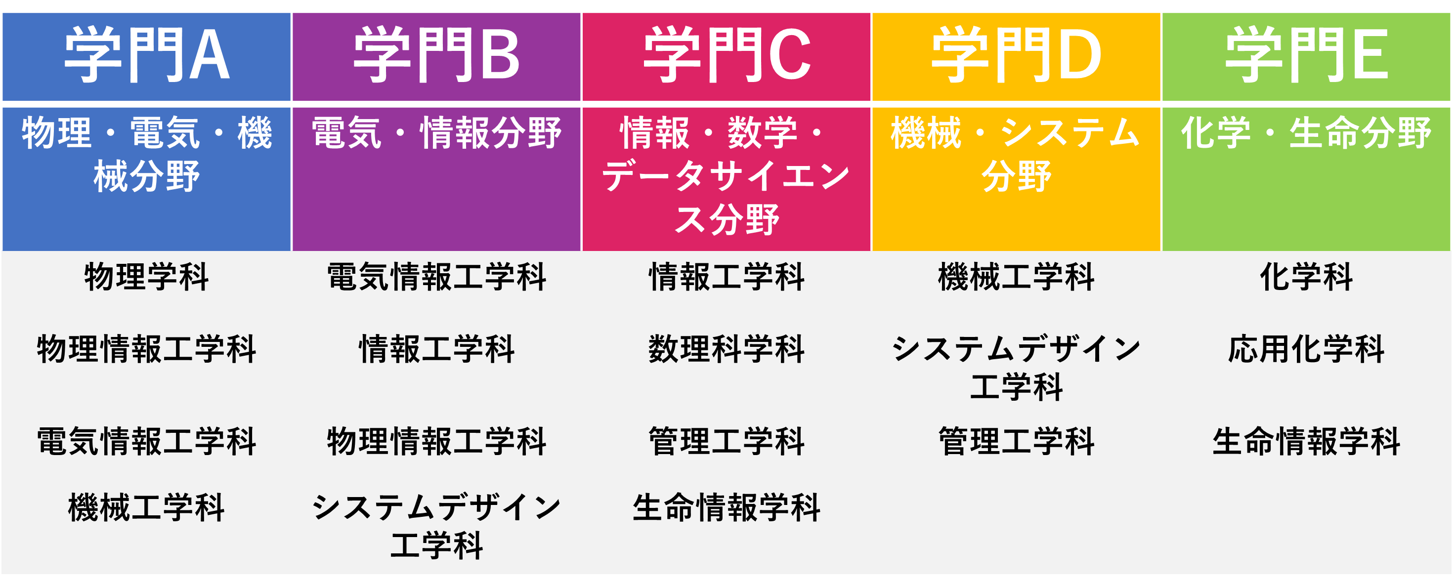 慶大の理工学部では、出願の際に学門をAからEの5つから選択し、1年生の間は出願の際に決めた学門に所属する。そして、2年生に進級する際に学科を選択することになる。慶大の理工学部には11の学科があるが、学科選択の際には学門に応じて選べる学科が限定されている。それぞれの学門から進学できる学科は以下の通りである。