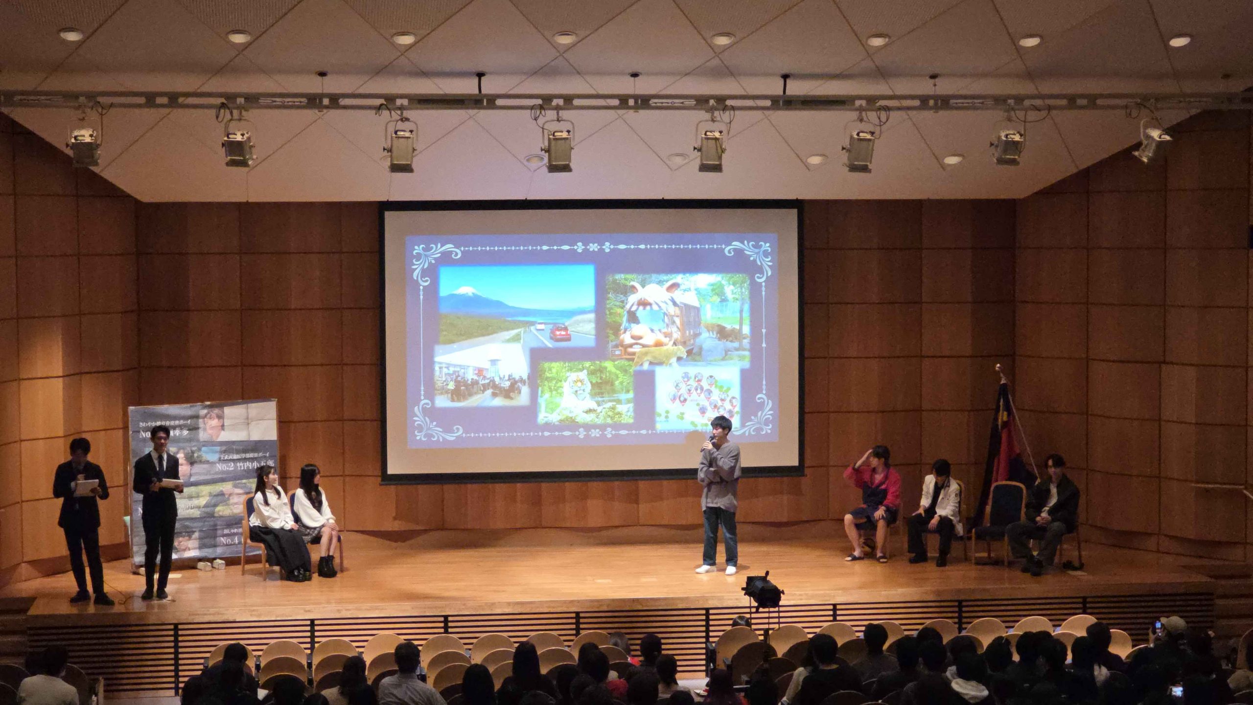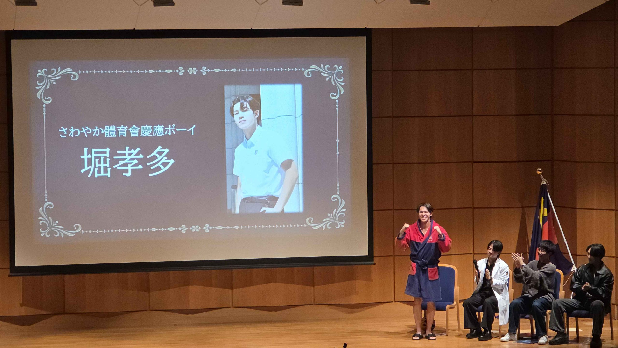 開催中最大の盛況を博す3日目の日曜日。正午を目前にして西校舎ホールには多くの観客が詰めかけた。司会に促され登場したのは、ハイスペックな男子塾生と銘打たれた4名。左側から、”さわやか體育會”堀考多さん、”文武両道医学部”竹内小五郎さん、”意識高い系”垂見浩史さん、”おしゃれ活動家”西山サリイさんだ。