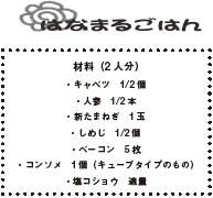 材料(2人分)・キャベツ 1/2個・人参 1/2本・新たまねぎ 1玉・しめじ 1/2個・ベーコン 5枚・コンソメ 1個(キューブタイプのもの)・塩コショウ 適量